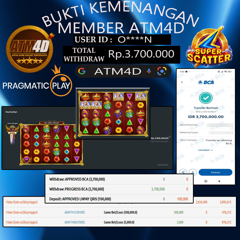 Selamat Kepada Member Yang Berhasil Mendapatkan Jackpot Dipermainan PRAGMATIC PLAY, Berikut Bukti Jackpot Member Di Situs ATM4D