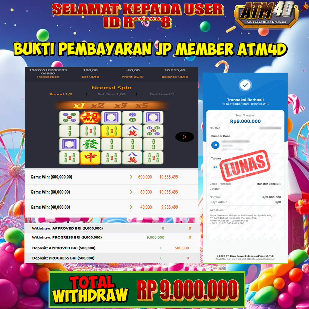 Jangan lewatkan kesempatan untuk meraih kemenangan besar. Daftar sekarang di ATM4D dan rasakan pengalaman bermain slot terbaik yang pernah ada! Putar gulungan, menangkan jackpot, dan jadilah bagian dari komunitas pemain sukses kami!