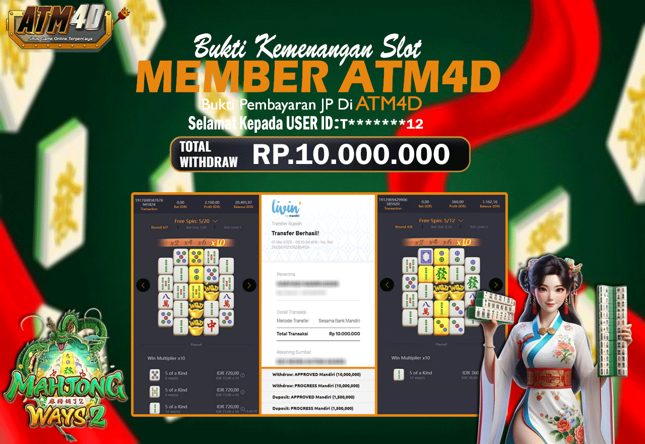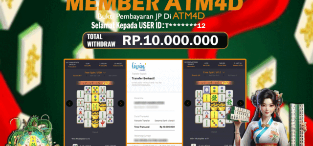 Jangan lewatkan kesempatan untuk meraih kemenangan besar. Daftar sekarang di ATM4D dan rasakan pengalaman bermain slot terbaik yang pernah ada! Putar gulungan, menangkan jackpot, dan jadilah bagian dari komunitas pemain sukses kami!