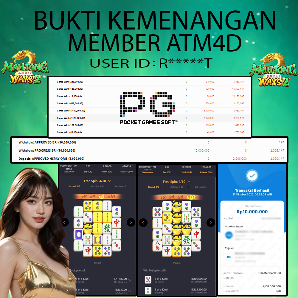 Jangan lewatkan kesempatan untuk meraih kemenangan besar. Daftar sekarang di ATM4D dan rasakan pengalaman bermain slot terbaik yang pernah ada! Putar gulungan, menangkan jackpot, dan jadilah bagian dari komunitas pemain sukses kami!